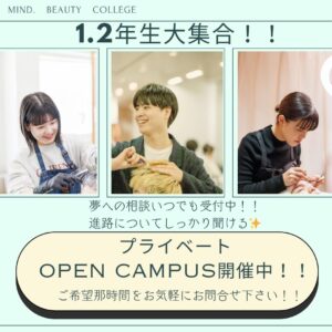 NEWS&TOPICS 2025.12.20 \\1.2年生大歓迎// プライベートオープンキャンパス!! NEWS&TOPICS 2025.12.11 12/13(土)のOPEN CAMPUSはXmas party!! NEWS&TOPICS 2025.11.05 11/29(土)のオープンキャンパスは、校内コンクール見学&美容クイズ!! NEWS&TOPICS 2025.10.16 10/25(土)のオープンキャンパスは、ハロウィン仮装大会!! NEWS&TOPICS 2025.10.05 休校のお知らせです!! NEWS&TOPICS 2025.09.24 R8年度入試についてお知らせ!! NEWS&TOPICS 2025.09.16 10/5(日)のオープンキャンパスはMIND.芸術祭!! NEWS&TOPICS 2025.08.26 AOエントリー締め切り9/19(金)まで✨ NEWS&TOPICS 2025.08.23 9/13(土)のオープンキャンパスは、『秋の美容チャレンジ!!』+『美容体験♪』 NEWS&TOPICS 2025.08.23 第17回全国理容美容技術大会 中国地区大会!!まつ毛エクステンション部門 敢闘賞✨ NEWS&TOPICS 2025.08.09 8/20(水)の平日のオープンキャンパス NEWS&TOPICS 2025.08.09 夏季休暇のご案内 NEWS&TOPICS 1 / 3123»